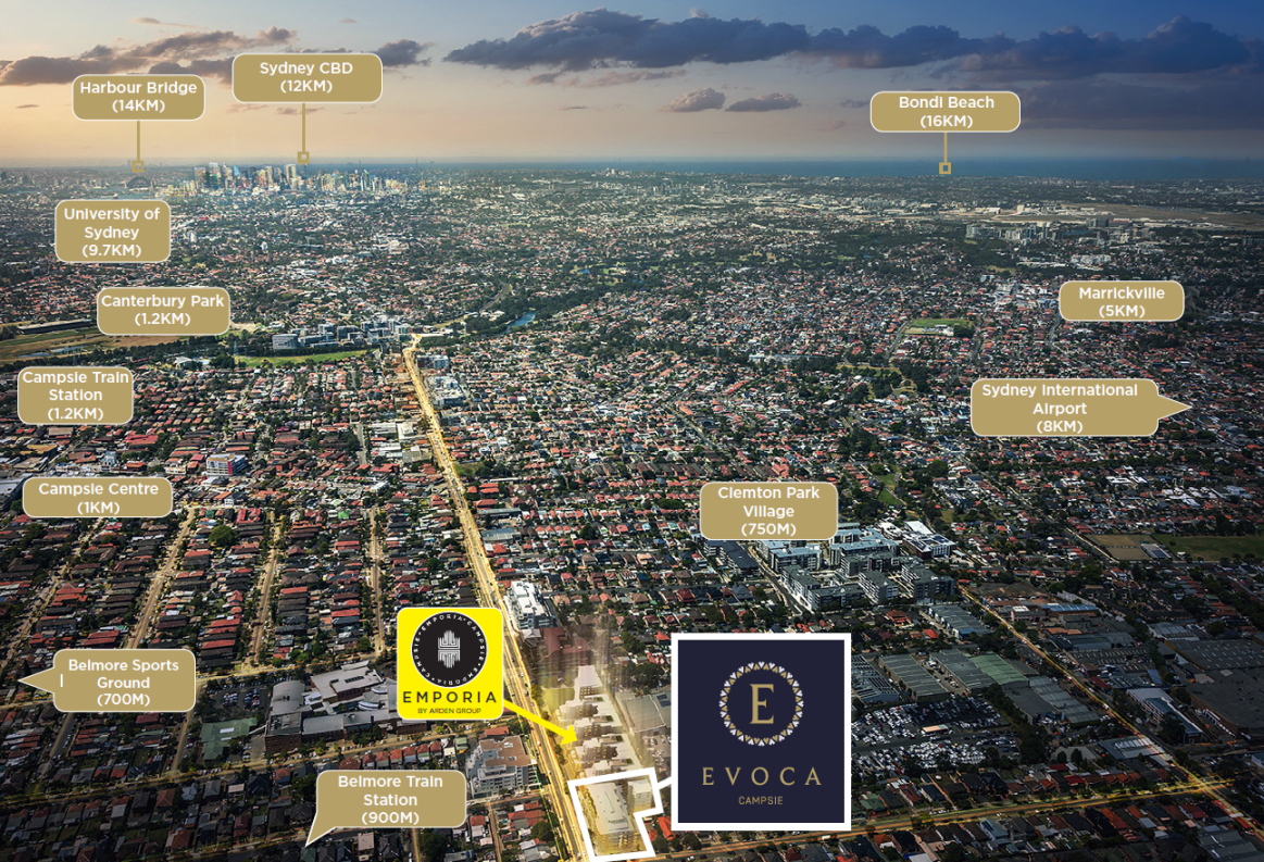 Evoca comprises a selection of 81 luxury apartments. These light filled, spacious apartments are fitted with premium quality fittings and appliances. Located 13km from the Sydney CBD and 1km from Campsie Town Centre.