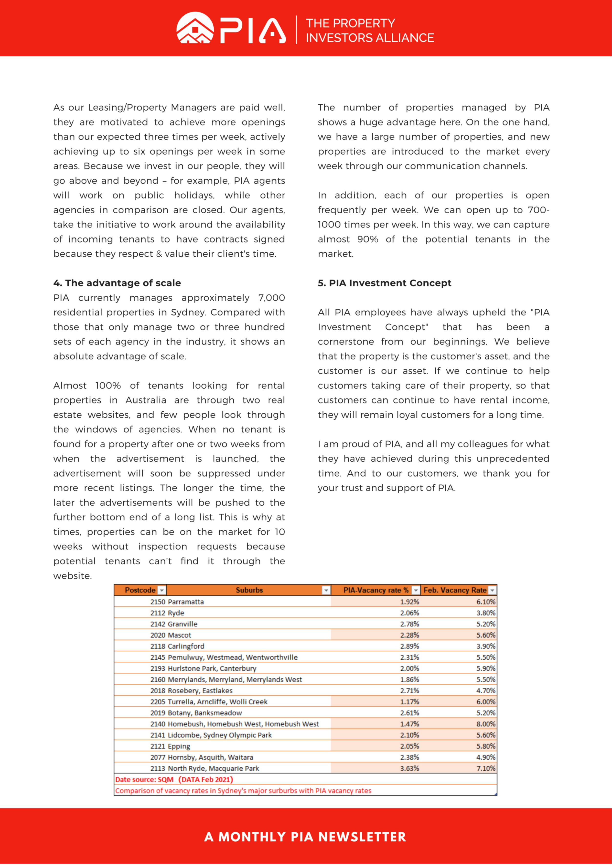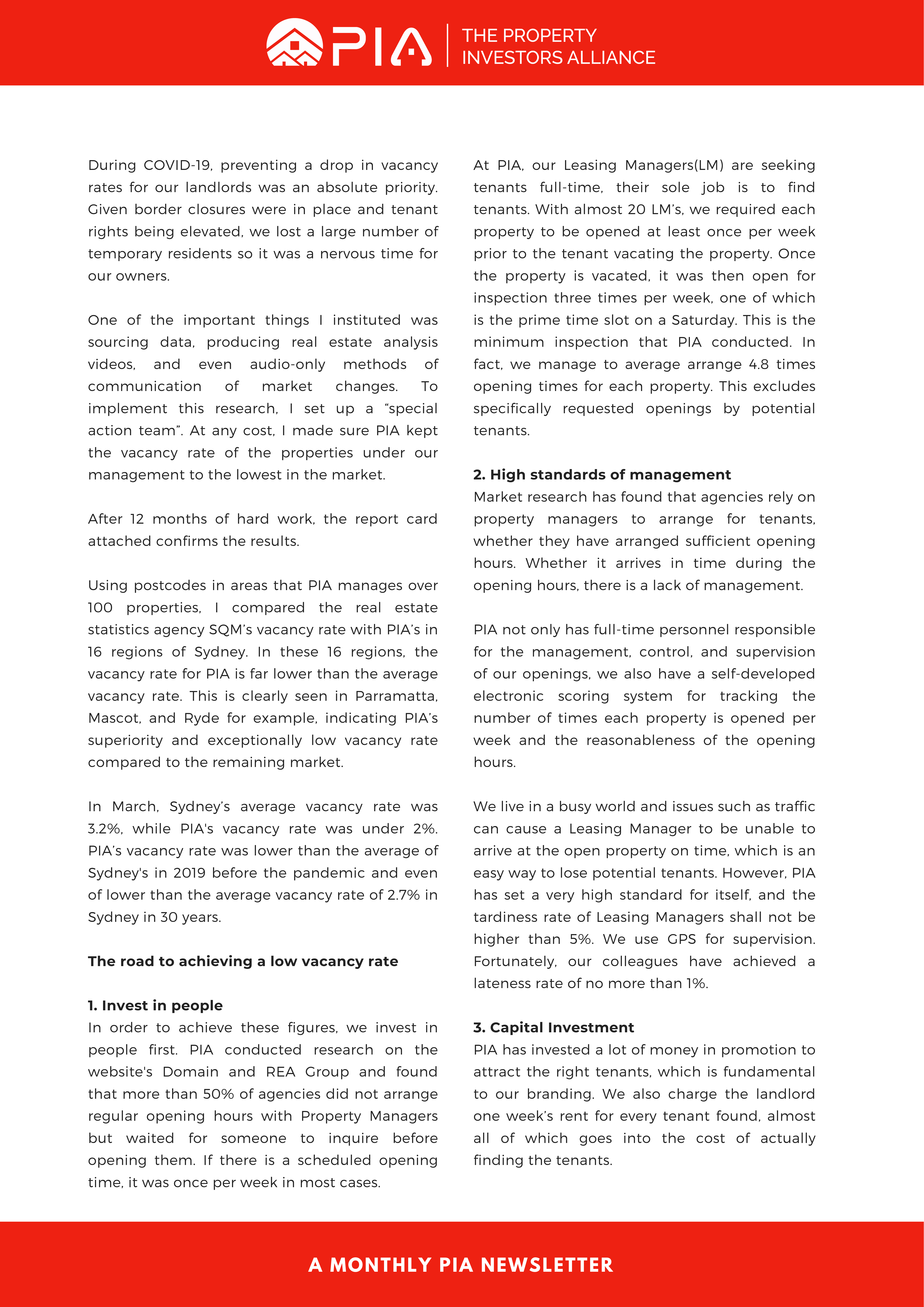 Why can PIA Property Management achieve a 2% vacancy rate in the current climate?